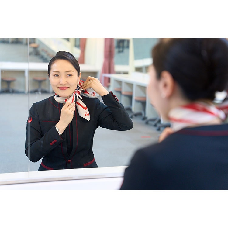 フライトに行く前に鏡の前でスカーフを整えている様子を撮影します。