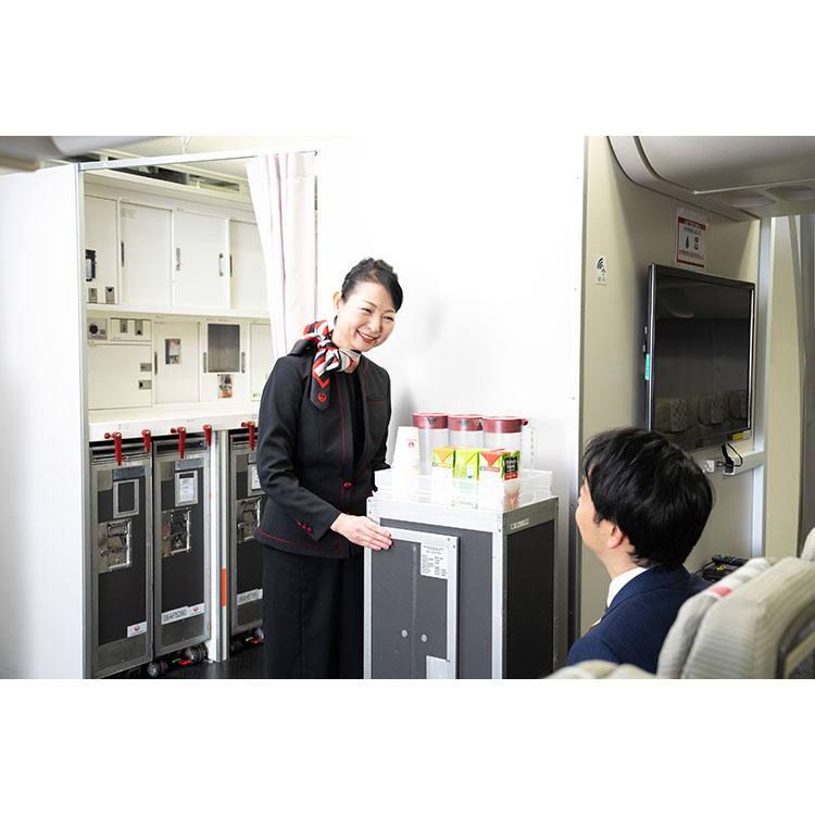 ヘアメイクアップアーティストによるJALの美容基準に基づいたヘアメイクと本物の制服一式をご着用いただき、JALの訓練施設でドリンクサービスや機内アナウンスを体験いただきます。