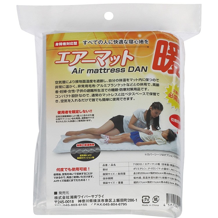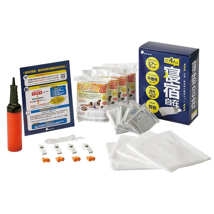 ●箱サイズ(約):縦29.7×横22.0×厚み11.0cm ●重量(約):1,800g ●材質:エアーマット/ポリプロピレン、簡易アルミ毛布/アルミ蒸着ポリプロピレン、不織布シーツ/ポリプロピレン、防災用ホイッスル/ABS樹脂 ●仕様:耳栓/EN352-2 防音保護具「耳栓」適合 ●同梱物:エアーマット(W600×H2000×D50mm)×4個、不織布シーツ(W800×L1800)×4枚、簡易アルミ毛布(W1400×H2200×D50mm)×4枚、耳栓×4組、ホイッスル(紐付き)×4個、空気入れ(カラーはランダム)×1個、伝言ダイヤルガイド×1枚 ●日本製
