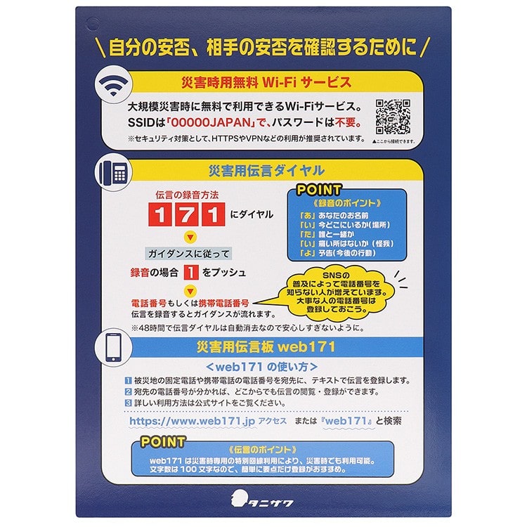 ・ 災害時に無料で利用できるWi-Fiサービス「00000JAPAN」、災害用伝言ダイヤル「171」、災害用伝言板「web171」の内容を記載したガイドを用意。