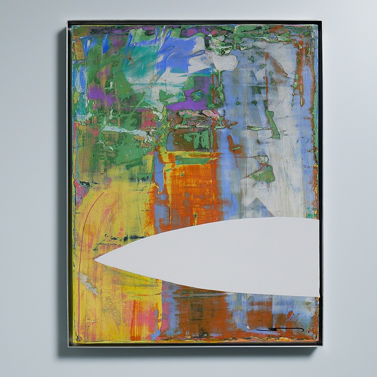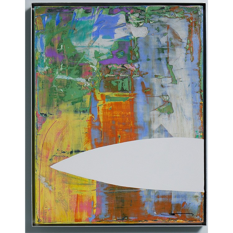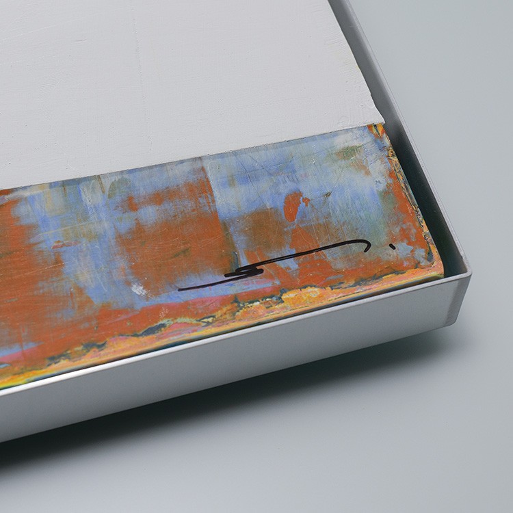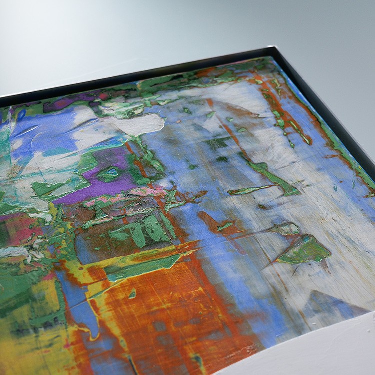 本作品も、キャンバスに何層にも色を塗り重ね、色層を削り出しながら描いており、