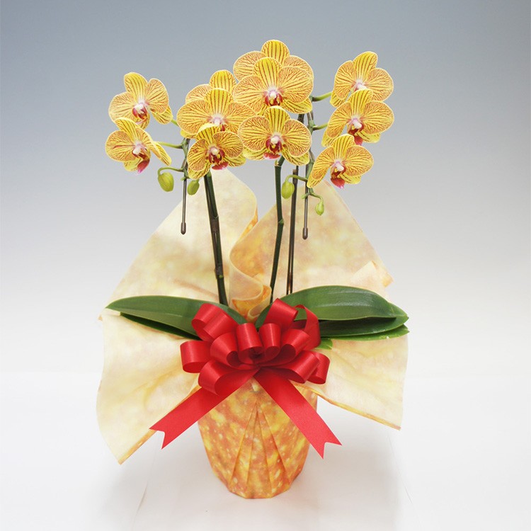 鮮やかなオレンジ色の胡蝶蘭は見ているだけで元気に、明るい気分になれそうです。特徴ある花模様で流通量が少なく、希少価値の高い品種です。同系色のラッピングでさらに華やかにしてお届けします。