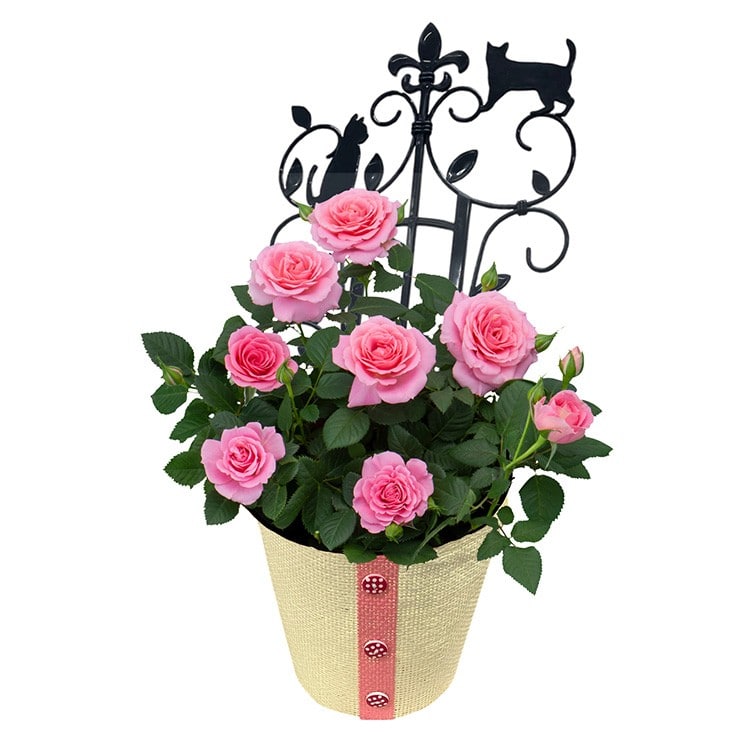 ●サイズ(約):高さ30cm×幅15cm ●重量(約):1000g ●仕様:ミニバラ「フェリシタス」5号鉢、バスケット、猫のトレリス、母の日カード、お手入れのしおり ●生産国:植物/日本製、カバー/中国製