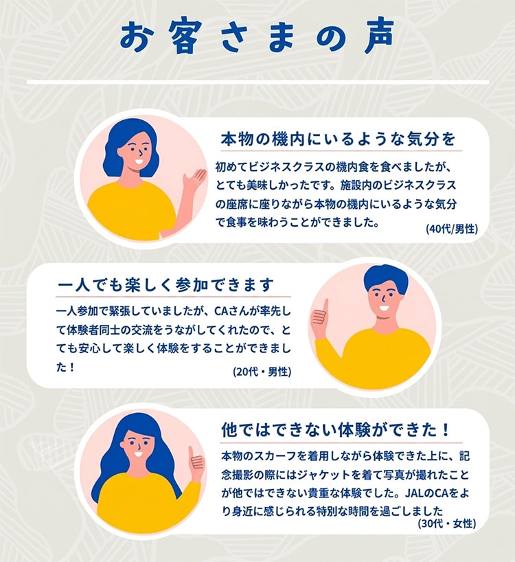 ※お申し込み後、JALショッピング(jal-shopping@jalux.com)より『参加者登録Forms』をお送りいたしますので、必ずご回答ください。 ご回答いただけない場合は、一部制服着用体験にてスカーフまたはネクタイがご用意できない場合があります。 お手伝いを必要とするお客さまは、『参加者登録Forms』にて詳細をお知らせください。 施設の仕様によりご同行者さま帯同の上でのご参加をお願いする、または一部のコンテンツにご参加いただけない場合がございます。 ※開催日が近くなりましたら『当日のご案内』をお送りいたしますので、必ずご確認ください。(開催前3日前後) ※「参加者登録Forms」の回答確認ができない場合・当日のご来場が確認できない場合は日本航空株式会社(JAL_CA_BUSINESS(jal_ca_business@jal.com)から メールもしくは『CA体験プログラム事務局』よりお電話にてご連絡を差し上げる場合がございます。 ※当日は受付にて身分証明書をご提示いただきますので、必ずご持参ください。 ※受付時間終了から15分を過ぎますと、本体験にご参加いただけない場合がございます。 ※当日の服装は自由です。お持ちの方は以下アイテムを着用の上お越しいただくと、より実際の制服に近いスタイルで体験にご参加いただけます。 ■女性(スカーフ着用予定):襟なし黒系のインナー、ボトムスはタイトな黒系スカート・黒系スラックスもしくは黒系ワンピース、黒ストッキング、プレーンタイプの黒パンプス ■男性(ネクタイ着用予定):白いワイシャツ、ボトムスは黒系スラックス ※着替え用ロッカーのご用意はございません。 ※アレルギー対応食など特別食のご用意はありません。機内食が不要な場合の返金はありませんので予めご了承ください。また、機内食のお持ちかえりもできません。 ※体験中は必ず係員の指示に従ってください。訓練施設内の写真・動画撮影は保安上の理由などにより、制限させていただく場合があります。 ※当日はJALグループのスタッフがツアーの様子を撮影し、お客さまの用紙を確認できる映像・写真などを使用させていただく場合があります。 ご了承いただけない場合は、ご参加者さまの情報登録の際、撮影に関する設問で「承諾しない」をお選びください。 ※日本航空株式会社は、体験の一部運営・実施業務を株式会社ジャルパックに委託しています。 ※日本航空株式会社、株式会社ジャルパックのスタッフが同行します。