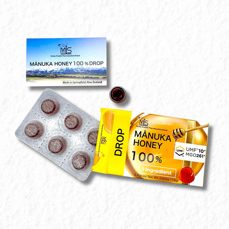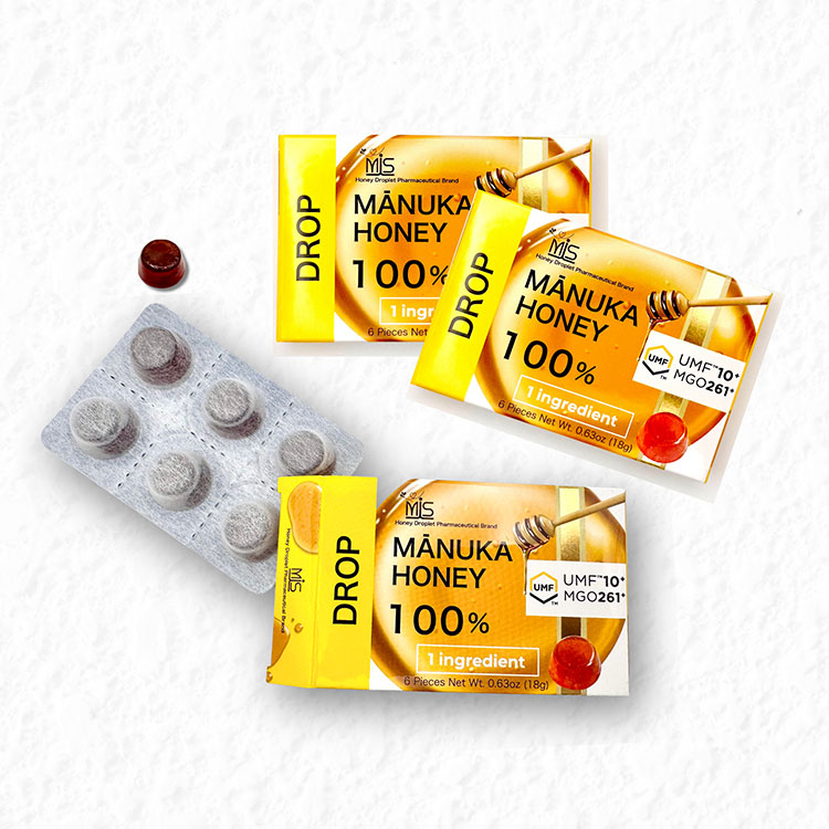 世界で唯一の日本の技術により世界中のはちみつ業界の永遠の夢、マヌカハニー100%を固形化した、のど飴タイプ。持ち歩き用にまとめ常備しておくと安心。