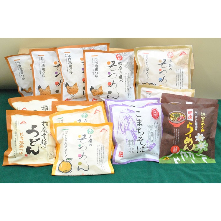 秋田県湯沢市産の手延素麺は、あっさり醤油味、風味豊かな柚子味噌味、体が温まる生姜味の3種で。さらに北海道産の即席そば、秋田名産稲庭うどん、神室山ラーメンも入った充実のセットです。