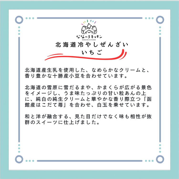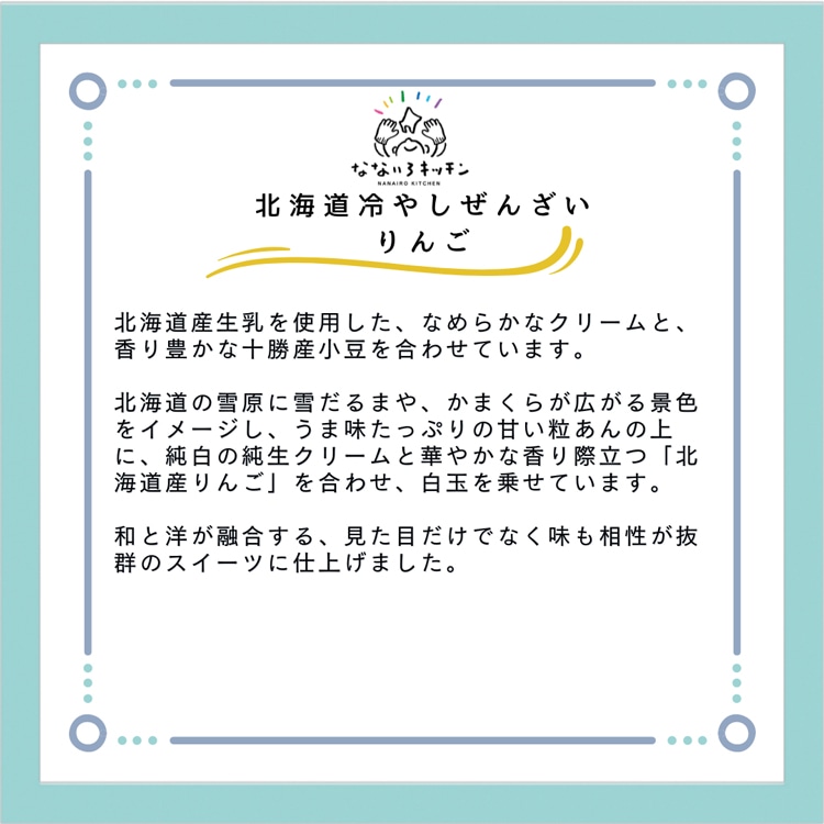 北海道産小豆・函館産いちご・りんごを使用した彩豊かな冷やしぜんざいです。北海道で製造されたもち米粉も使用し、もちもちの白玉になっております。