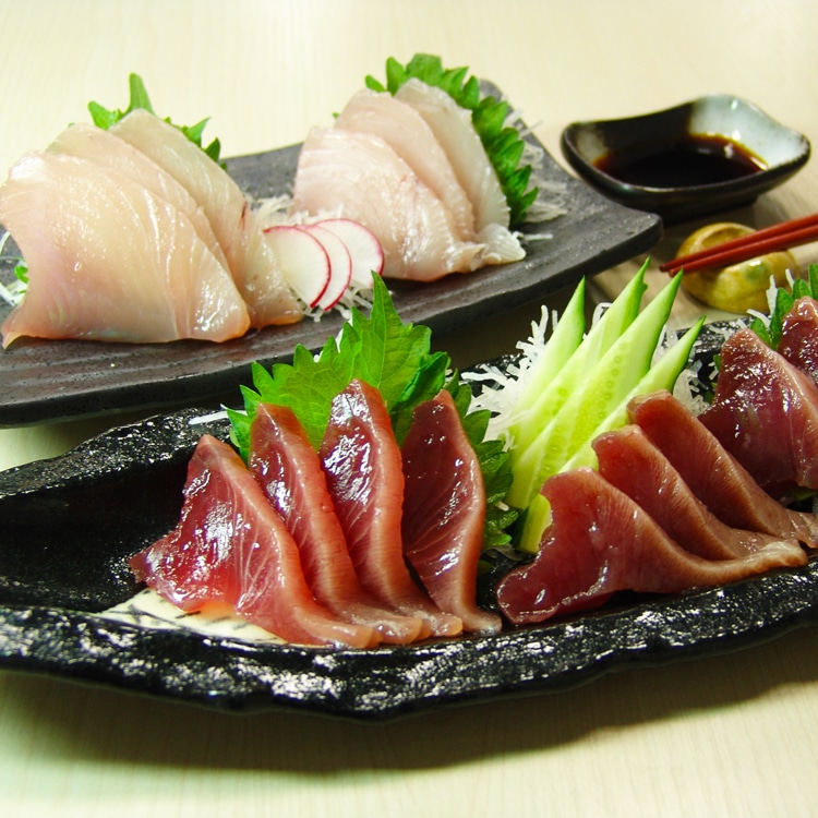 日本の東沖で獲れたまぐろかつおのお刺身です