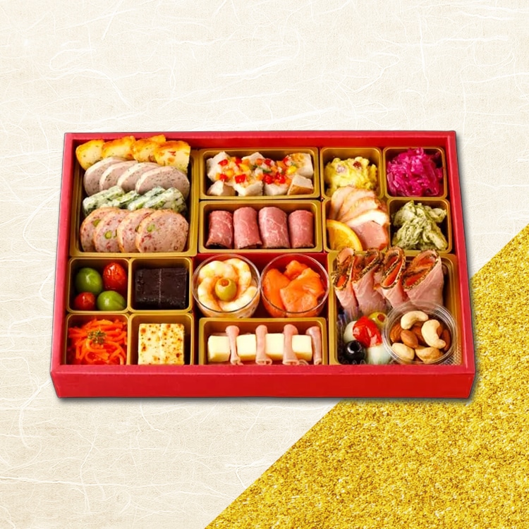 ローマイヤレストラン銀座店監修の洋風のオードブル。ローストビーフやローストポーク、ソーセージをつかったメニューを盛り付けました。大人から子供まで家族そろって楽しめるオードブルです。【壱の重】