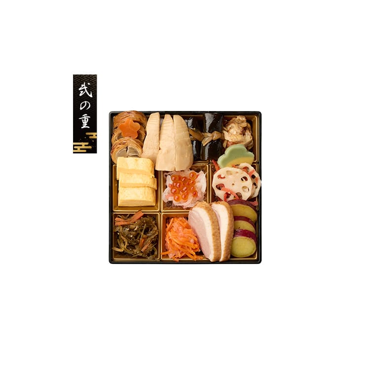 湯葉八幡巻、穂先筍旨煮、にしん昆布巻、松麩シロップ漬、とり皮ポン酢和え、出汁まき玉子、紅白なま酢、いくら醤油漬、蓮根柚子マリネ、松前漬、合鴨スモーク、キャロットオニオンサラダ、おさつ甘露煮、味付小梅人参