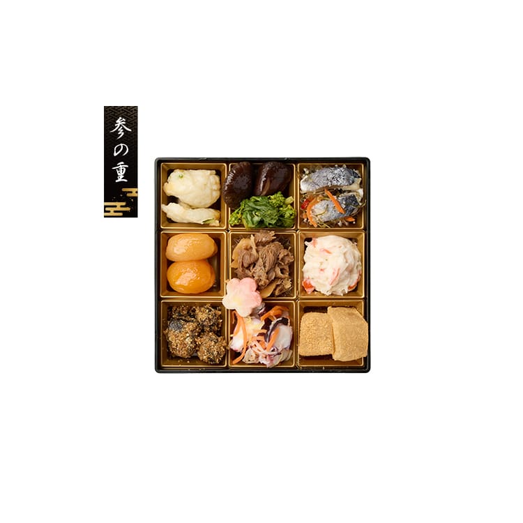 たたき牛蒡、たこ照焼、黒豆、爪付カニしんじょう、赤魚西京焼、牛時雨麩笹包み、伊達巻、海老艶煮、きんとん、栗甘露煮、味付数の子、田作り、青桃甘露煮、味付小梅人参