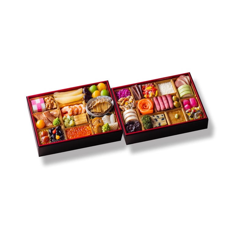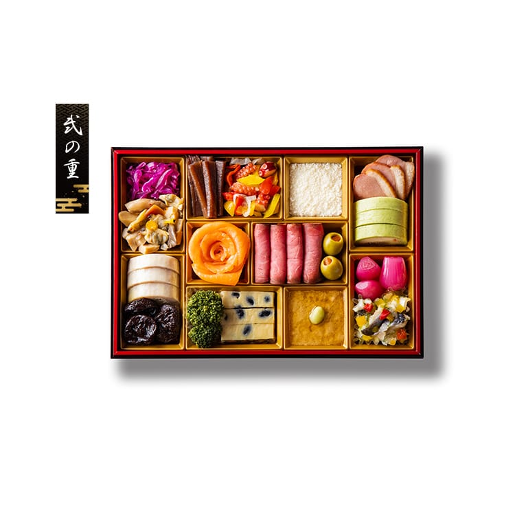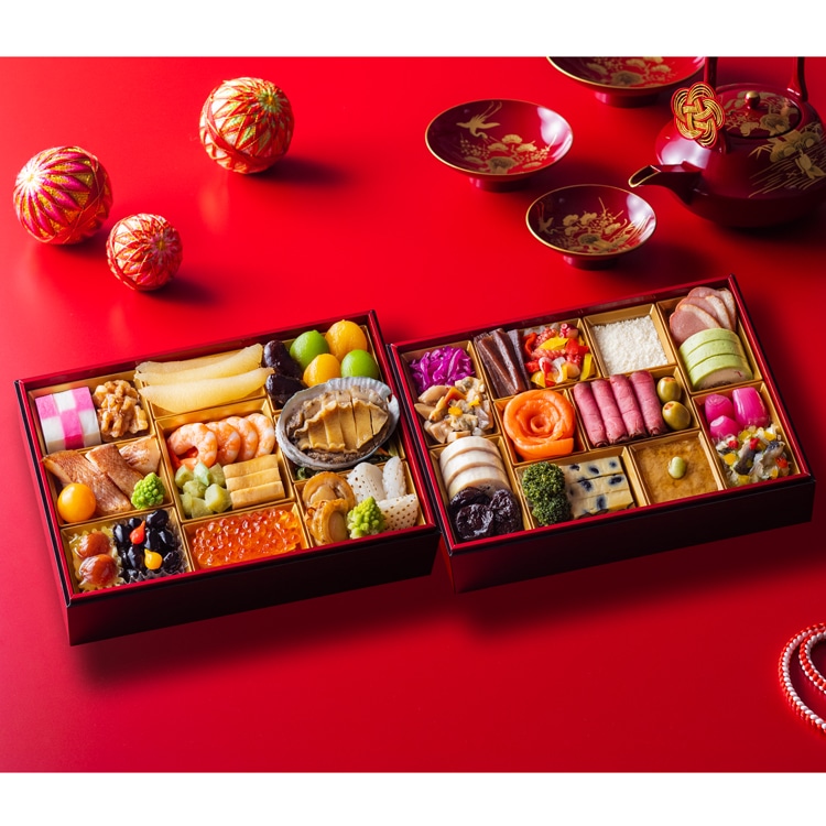中嶋寿幸シェフ監修の和洋おせちです。福を招く多彩な食材を自然で上品な味わいで仕上げた、贅沢二段重のおせち。一の重にバラエティ豊かで華やかな和風おせちを、二の重には、創作料理を中心に洋風料理を盛込みました。【壱の重】