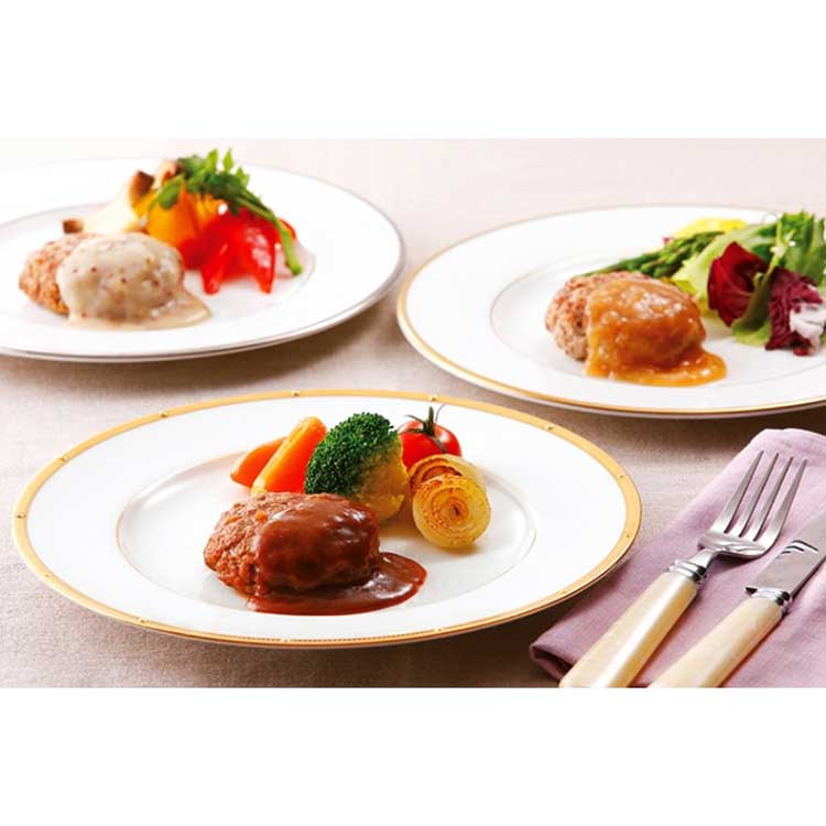 やまと豚と国産牛の合挽ハンバーグを3種類のソースでの味わいをご堪能ください。