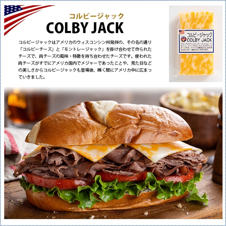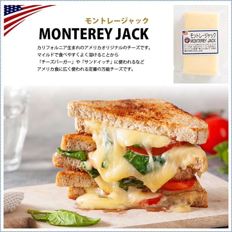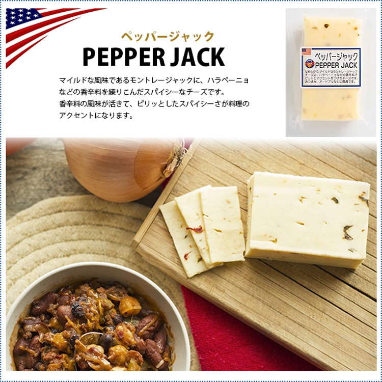 マイルドで癖のないモントレージャックと、マーブル模様のコルビージャック、香辛料が練り込まれていてスパイシーなペッパージャックの3品。ハンバーガーやサンドイッチと相性がよく、そのままウイスキーなどお酒のおつまみにもおススメです。商品情報