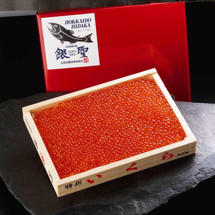 北海道日高産の銀毛鮭の中でも熟練の目利きが厳選したものだけが「銀聖」と称されます。その希少なブランド鮭から取れた新鮮ないくらのみを使用。地元の[漁吉丸]こだわりの漁師の味、塩のみで仕上げた塩漬けと、醤油と清酒に漬けた醤油漬けの2つの味をご用意しました。どちらもいくら本来の旨みを引き出した一品です。醤油漬けは〈D0753〉でご紹介しています。