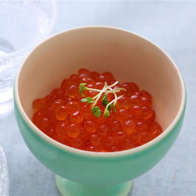 北海道日高産の銀毛鮭の中でも熟練の目利きが厳選したものだけが「銀聖」と称されます。その希少なブランド鮭から取れた新鮮ないくらのみを使用。地元の[漁吉丸]こだわりの漁師の味、塩のみで仕上げた塩漬けと、醤油と清酒に漬けた醤油漬けの2つの味をご用意しました。どちらもいくら本来の旨みを引き出した一品です。塩漬けは〈D0752〉でご紹介しています。