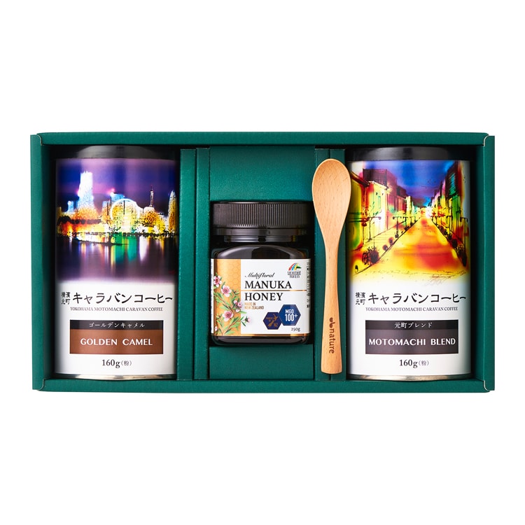〈ホンジュラス、コロンビア、他〉●内容:ゴールデンキャメル160g 160g×1個、〈タンザニア、ブラジル、他〉●内容:元町ブレンド160g 160g×1個、〈ニュージーランド製〉●内容:マヌカハニーMGO100+250g×1個、〈その他〉桜天然木スプーン 1本●常温240日