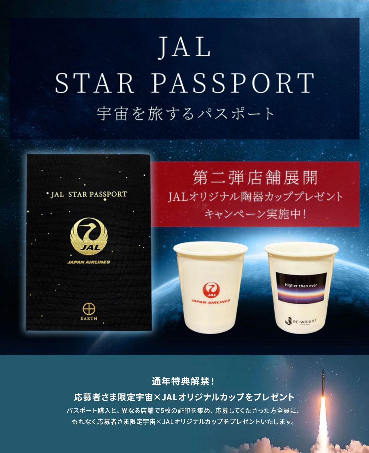 パスポート1冊と証印5枚で応募者さま限定の宇宙xJALオリジナルカップをプレゼントいたします。(今のところ特典期限は設けておりませんが、終了時は事前にSTARPASSPORTホームページにて周知いたします)なお、こちらの特典はこれからも店舗展開を進め枚数に応じて商品を増やしていく予定です。