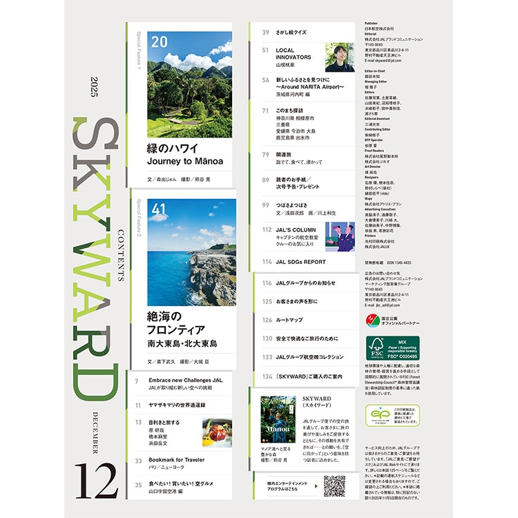 JALグループの国内線に搭載されている機内誌「SKYWARD」。 「空に向かって」という意味をもつ誌名には、空の旅をとおしてお客さまに旅のよろこびを提供し、その感動を共有したいという思いが込められています。 独自の視点で絞り込まれた海外や国内の旅の特集、話題の人へのインタビュー、興味深いエッセイ、さまざまなイベント情報、JALグループからのお知らせやお得な情報など、旅に関する興味深い記事が満載です。また、日本語の記事に加え、海外の方に日本を紹介する英語、中国語の特集も掲載しています。
