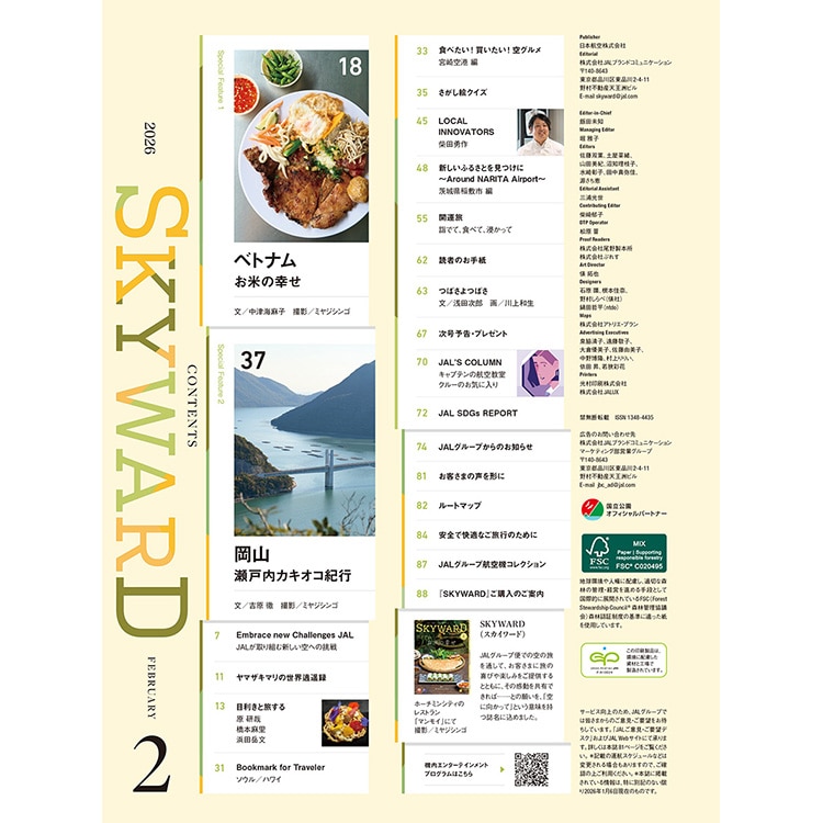 JALグループの国内線に搭載されている機内誌「SKYWARD」。 「空に向かって」という意味をもつ誌名には、空の旅をとおしてお客さまに旅のよろこびを提供し、その感動を共有したいという思いが込められています。 独自の視点で絞り込まれた海外や国内の旅の特集、話題の人へのインタビュー、興味深いエッセイ、さまざまなイベント情報、JALグループからのお知らせやお得な情報など、旅に関する興味深い記事が満載です。また、日本語の記事に加え、海外の方に日本を紹介する英語、中国語の特集も掲載しています。