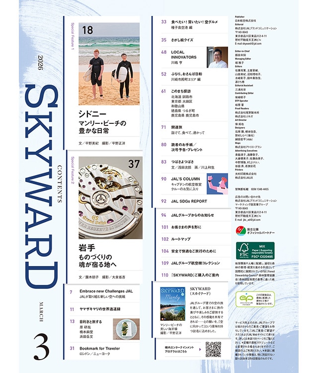 JALグループの国内線に搭載されている機内誌「SKYWARD」。 「空に向かって」という意味をもつ誌名には、空の旅をとおしてお客さまに旅のよろこびを提供し、その感動を共有したいという思いが込められています。 独自の視点で絞り込まれた海外や国内の旅の特集、話題の人へのインタビュー、興味深いエッセイ、さまざまなイベント情報、JALグループからのお知らせやお得な情報など、旅に関する興味深い記事が満載です。また、日本語の記事に加え、海外の方に日本を紹介する英語、中国語の特集も掲載しています。