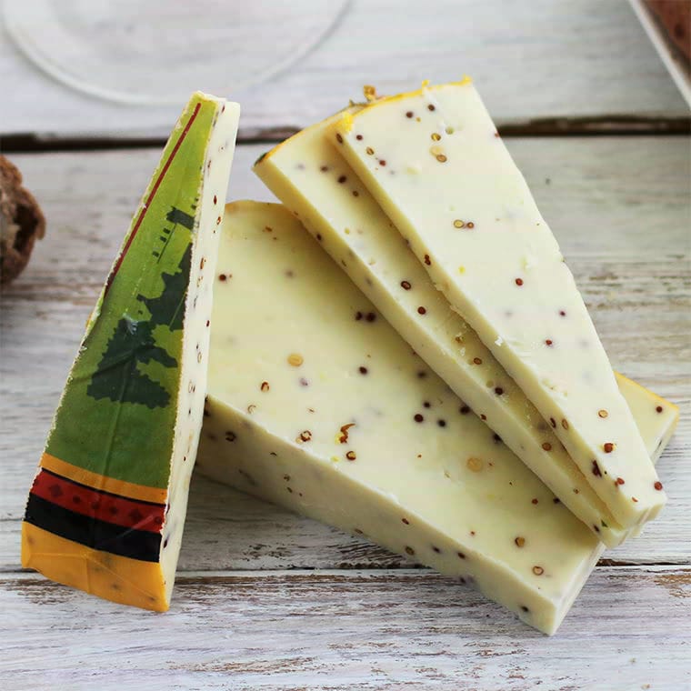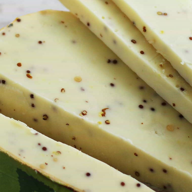 ゴーダに粒マスタードをたっぷりと加えたユニークなチーズです。ゴーダのミルクの旨味と甘みもじんわりと感じられます、マスタードの華やかな風味、プチプチとした食感が加わり、とても華やかです。
