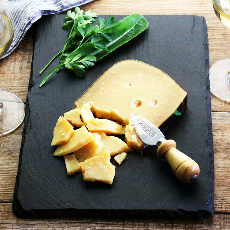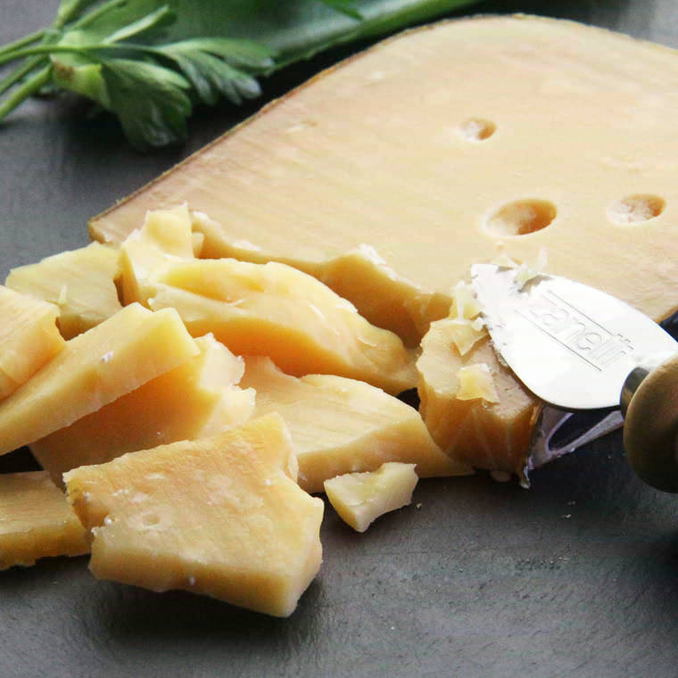 18~24ヶ月かけてじっくりと熟成され、固く引き締まった生地にはアミノ酸の結晶も見られます。甘みとコク、ナッツのような芳ばしい香りが広がり、余韻までしっかり楽しめる贅沢な味わいです。