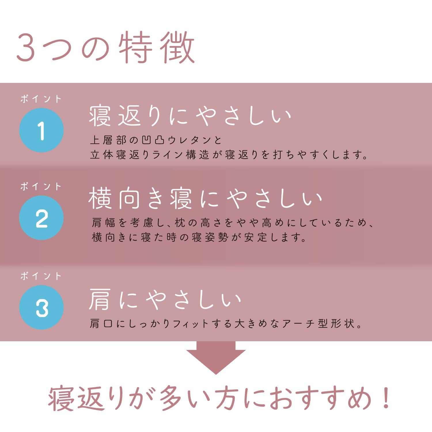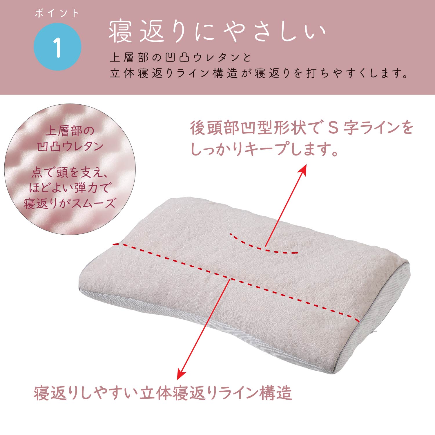 詰めものの上層部には、頭部を凹凸で支えるウレタンフォームを使用。ほどよい弾力と、枕の上下を分ける立体寝返りライン構造でスムーズに寝返りが打てます。