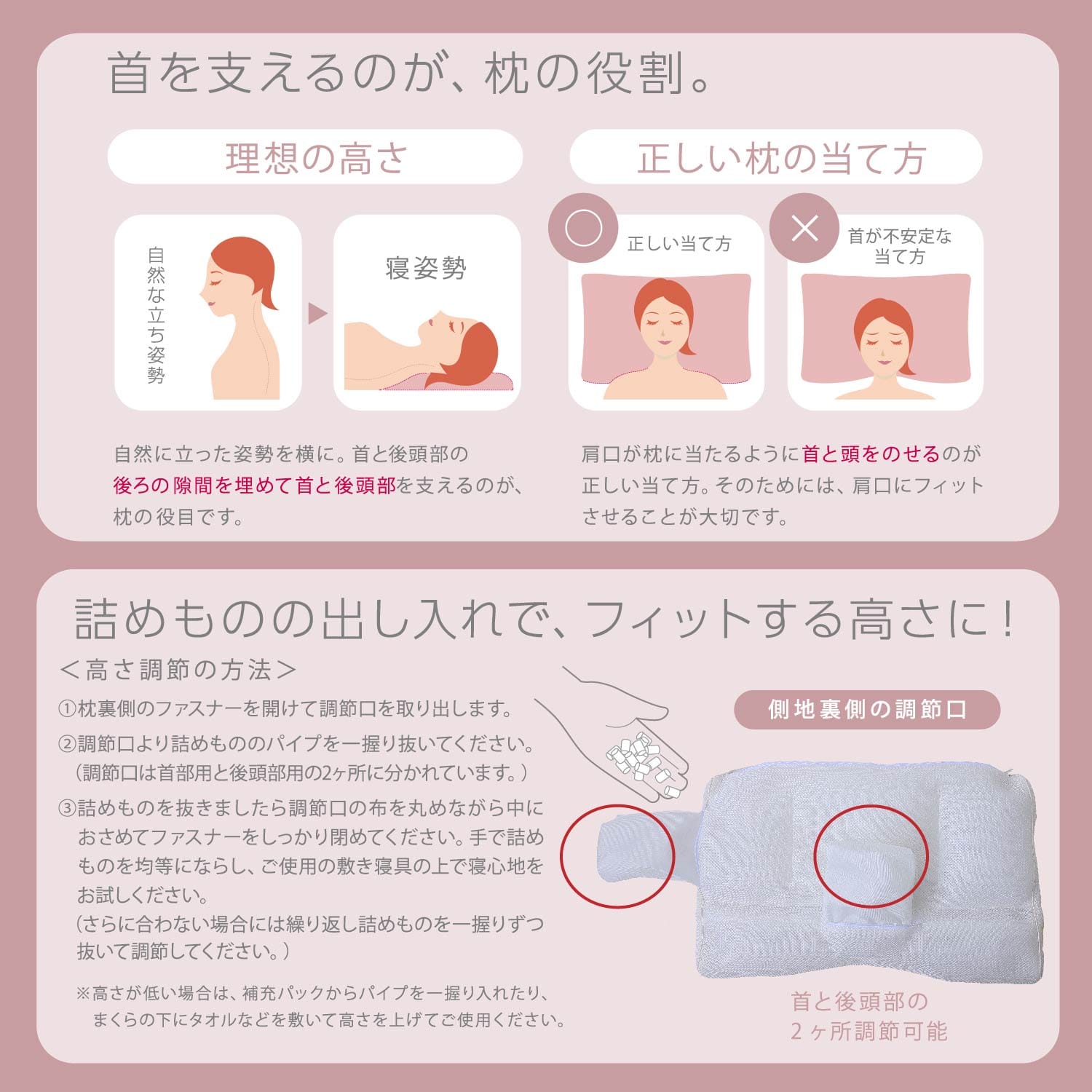 首部と後頭部の2箇所の高さ調整ができます。補充用パイプが付いているのでお好みに合わせて高さ調整が可能。