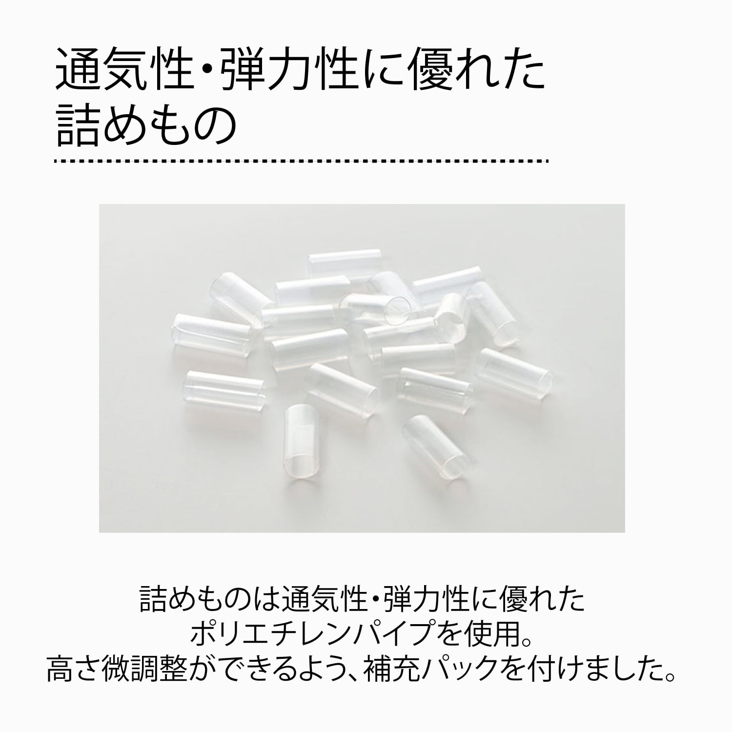 【組成】 側地:ポリエステル100% 詰めもの:(上層)ポリエステル100% (下層)ポリエチレンパイプ