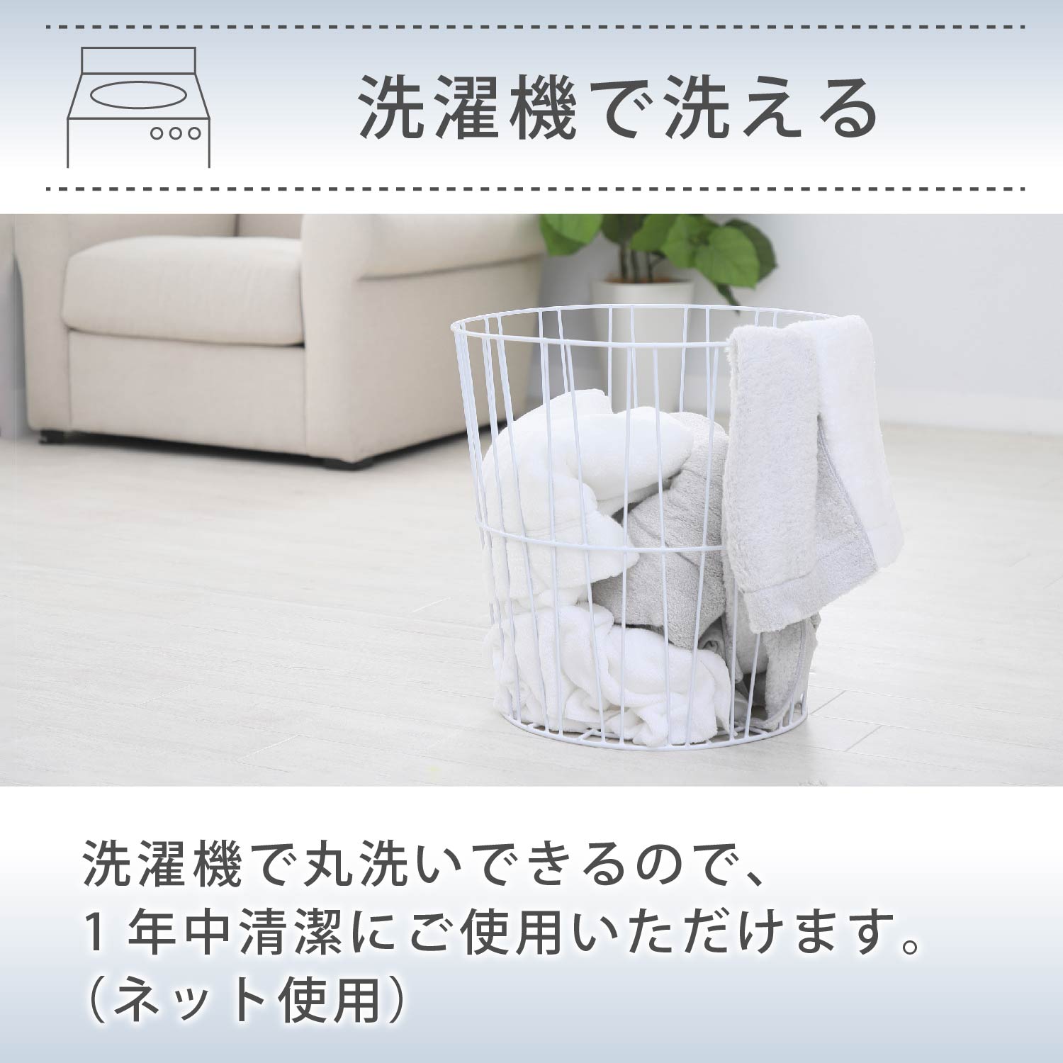洗濯機で洗えるので、衛生的です。(洗濯ネットをご使用下さい。ドラム式洗濯機では洗えない場合がございます)