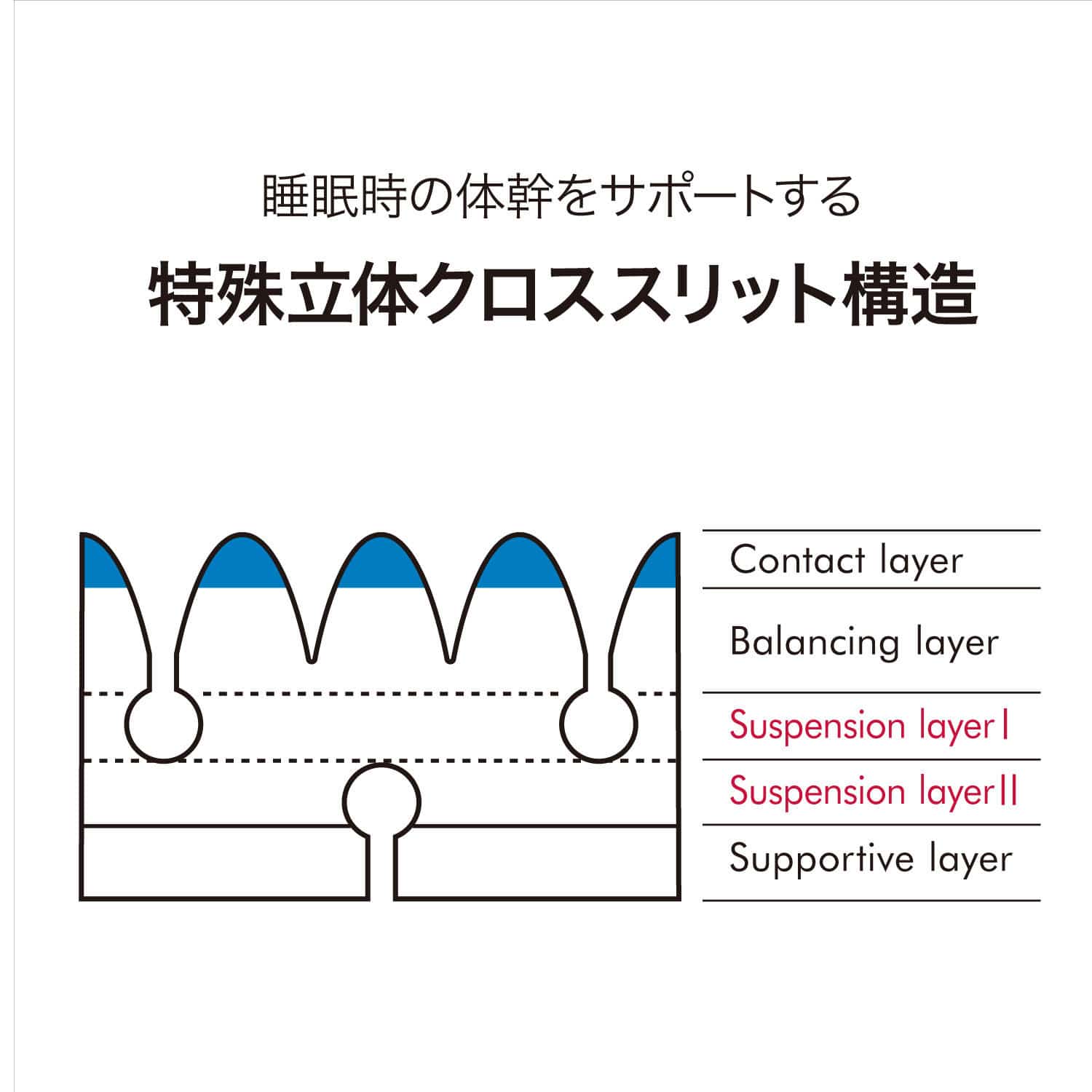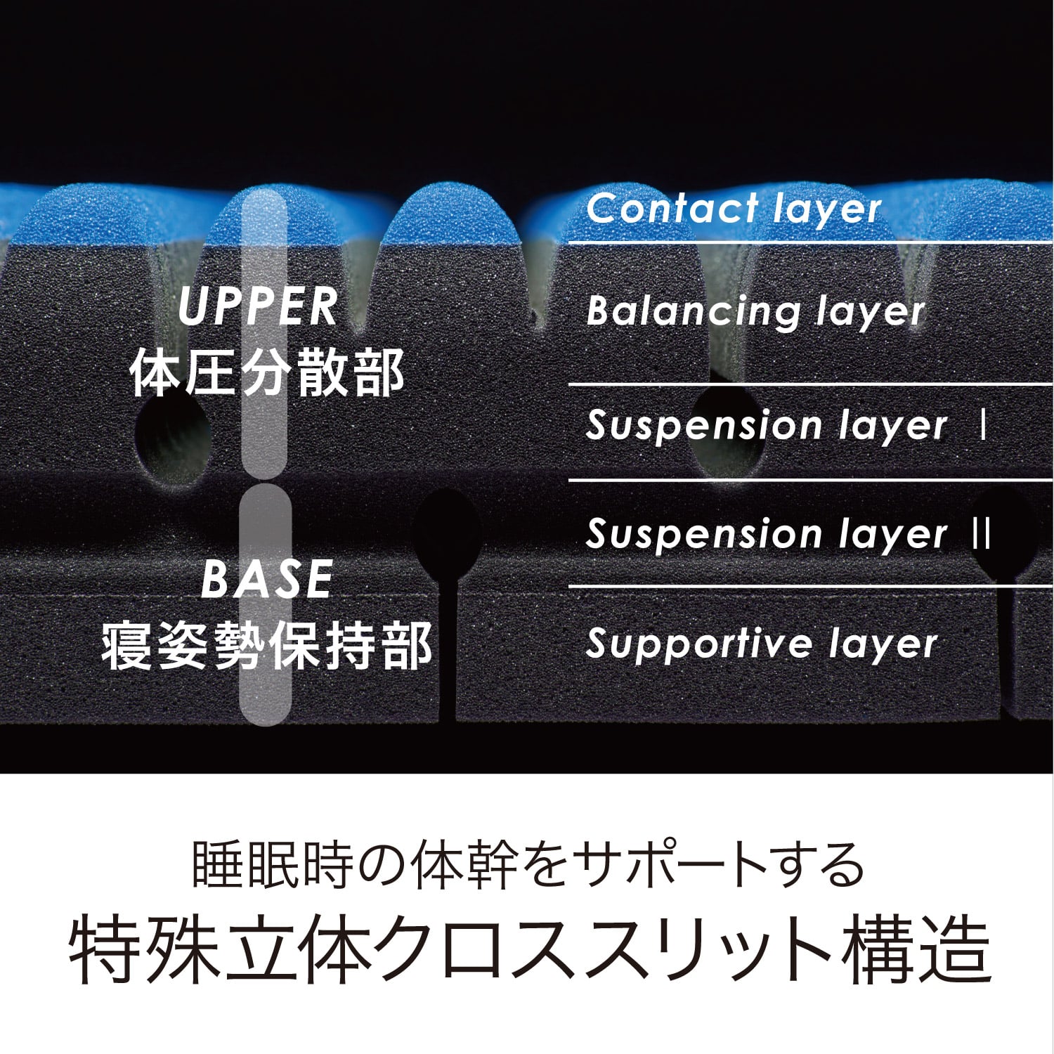 表面の1800個※もの点が体圧を分散し圧迫感を緩和。血行を妨げにくくする効果がより期待できファーストタッチも滑らかに進化しました。ウレタンフォームの通気を促進するタテ・ヨコにクロスするスリットが、縦方向と、横方向に、通気路を作り、湿気や汗の拡散を促進。※シングルサイズの場合