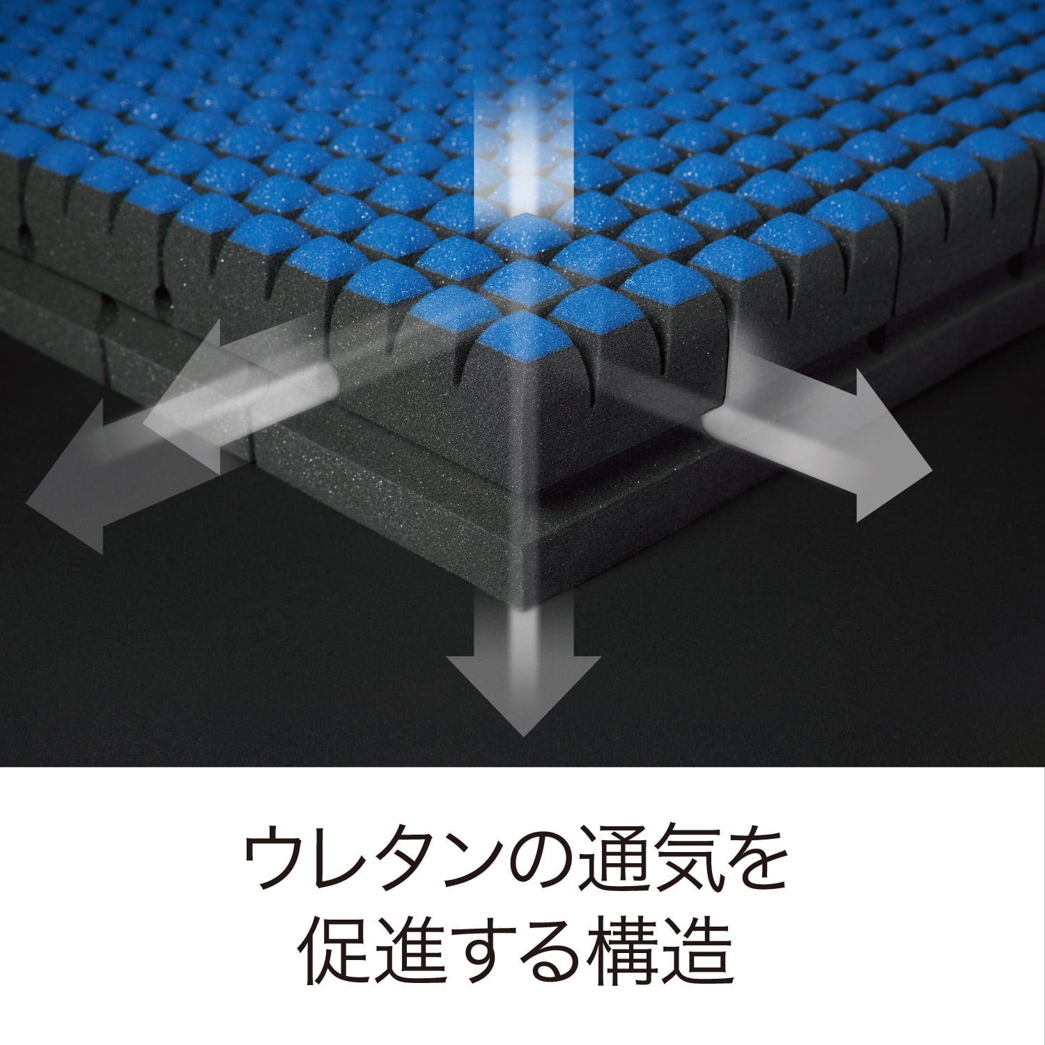 表面の1800個※もの点が体圧を分散し圧迫感を緩和。血行を妨げにくくする効果がより期待できファーストタッチも滑らかに進化しました。ウレタンフォームの通気を促進するタテ・ヨコにクロスするスリットが、縦方向と、横方向に、通気路を作り、湿気や汗の拡散を促進。※シングルサイズの場合