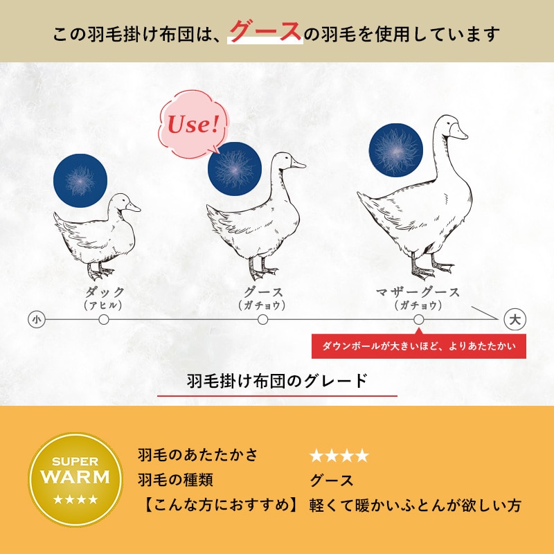 [組成]ふとんがわ:綿100% 詰めもの:ダウン90%フェザー10%(ポーリッシュホワイトグースダウン) 1.2kg