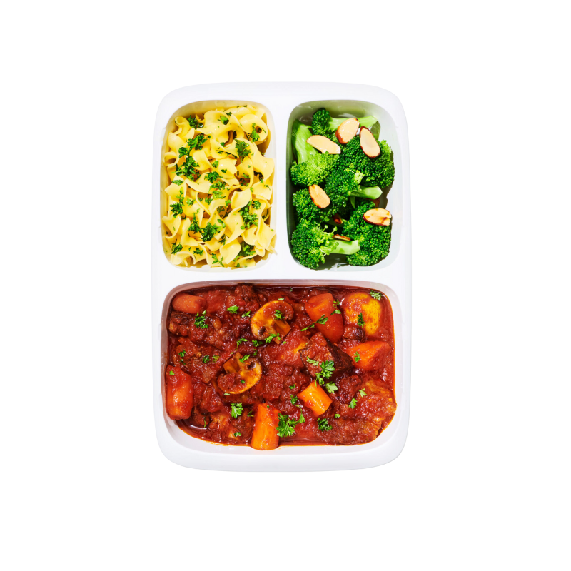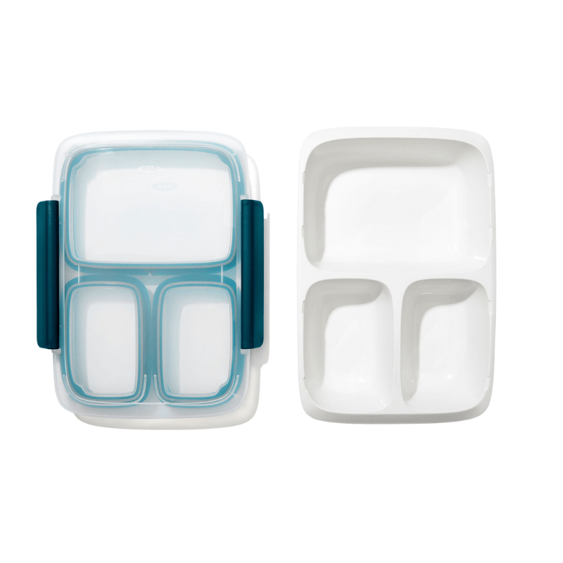 3つの独立して仕切られた容器で、さまざまな食材を分けて持ち運べる便利なサイズ。
