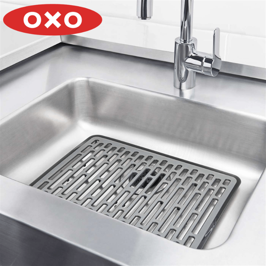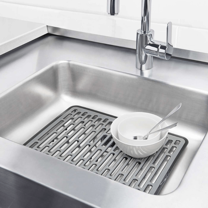やわらかいエラストマーの表面と、滑りにくい底面のアシ付きで、シンク内でしっかり安定します。