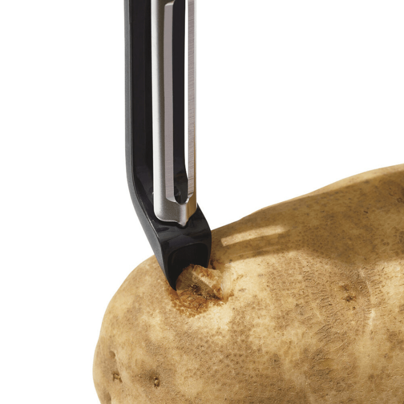 先端にはジャガイモの芽取りもあります。細長い食材では手前から向こう側へ向かって皮をむきます。