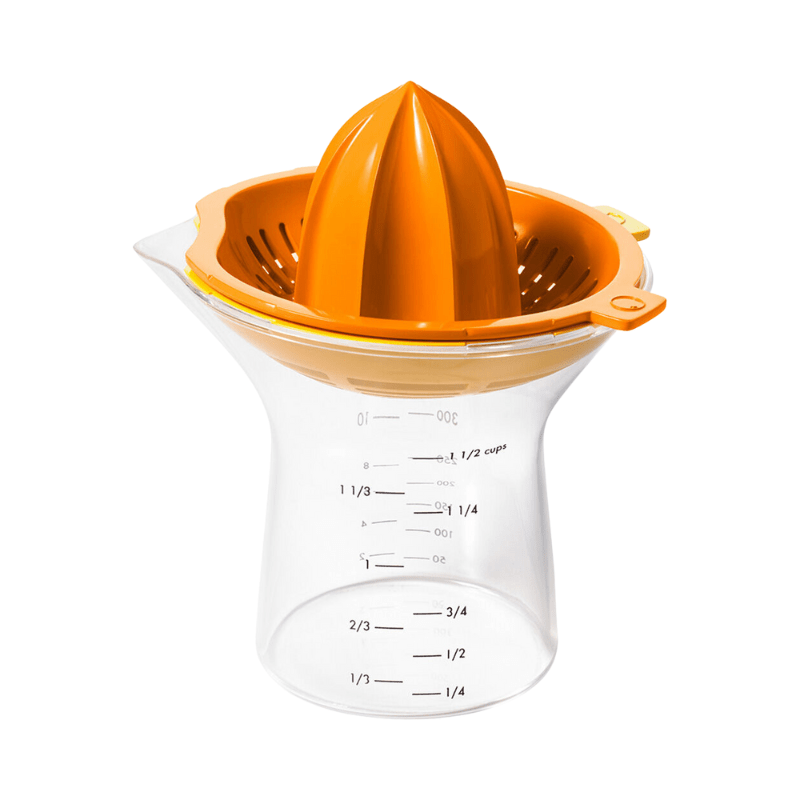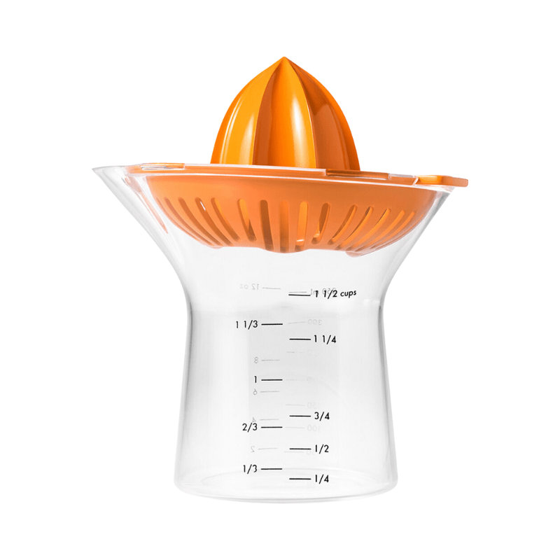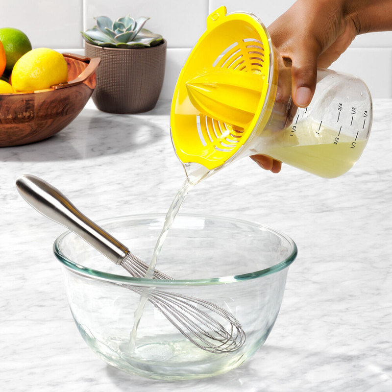 種や皮が落ちにくい仕様で、絞った後は注ぎ口から果汁をそのまま注ぐだけ。