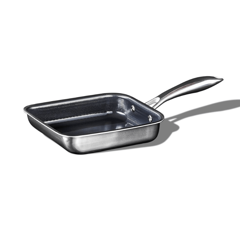 ステンレスの丈夫さと焦げ付きにくいノンスティック加工を兼ね備え、 まるで鋳鉄のような高い熱伝導率を誇るハイブリッドフライパン。 ハイブリッド技術により、熱分布が均一で、耐久性に優れ、お手入れがしやすいのが特徴です。