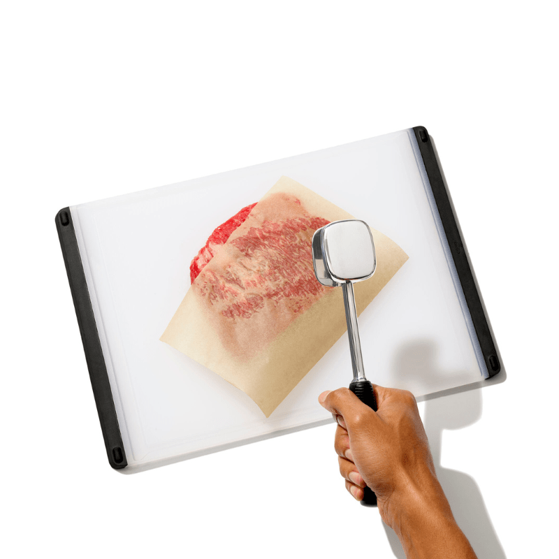 牛肉などのかたい繊維に最適なギザギザの面と、鶏肉などを均一にのばすのに便利な平らな面の