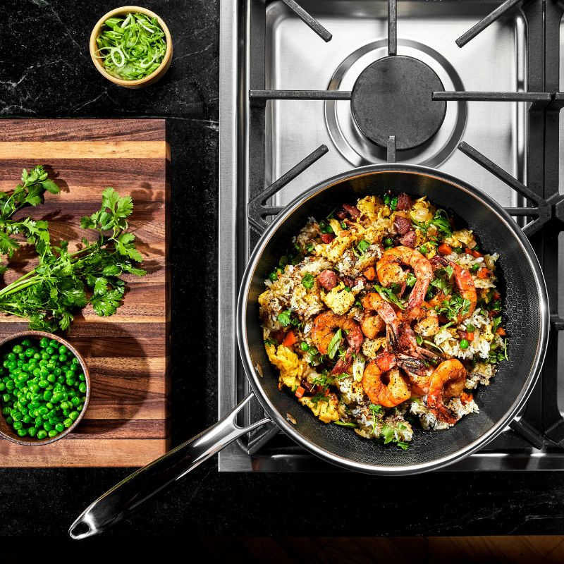 ステンレスの丈夫さと焦げ付きにくいノンスティック加工を兼ね備え、 まるで鋳鉄のような高い熱伝導率を誇るハイブリッドフライパン。 ハイブリッド技術により、熱分布が均一で、耐久性に優れ、お手入れがしやすいのが特徴です。