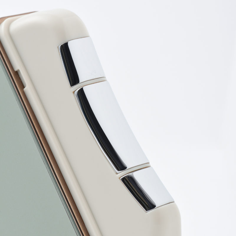 - 本体:ABS樹脂、アルミニウム合金(クロムメッキ)、スタンド:ABS樹脂