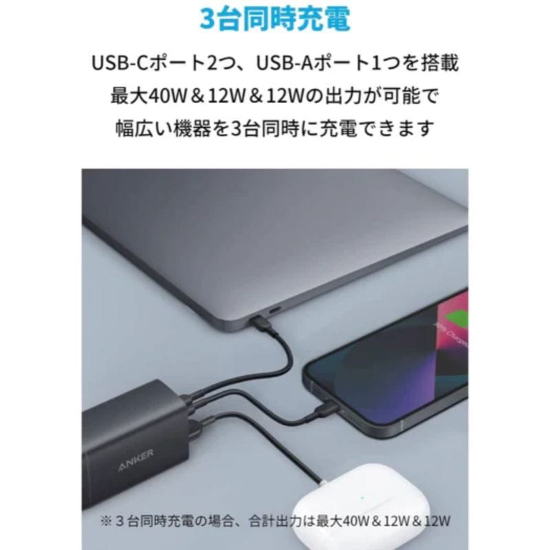 2つのUSB-CポートとUSB-Aポート使用時は最大40W&12W&12Wの出力で、幅広い機器を3台同時に充電できます。