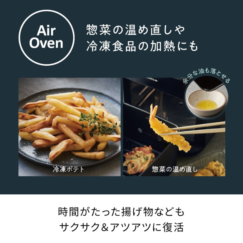 油を使わないノンフライ調理や、総菜の温め直し、冷凍食品の調理にも。