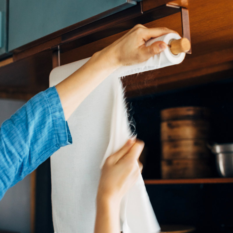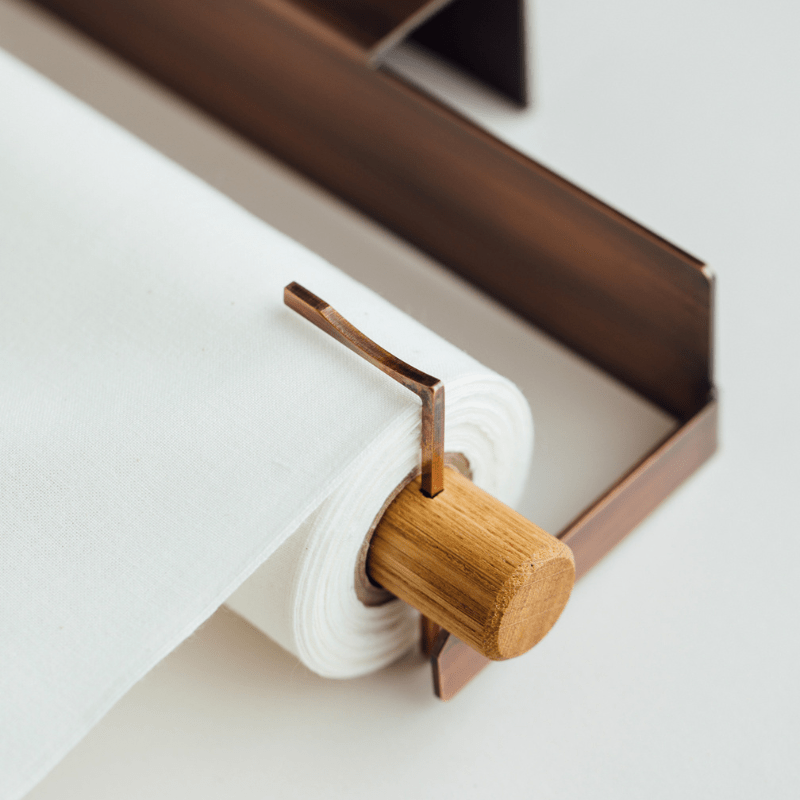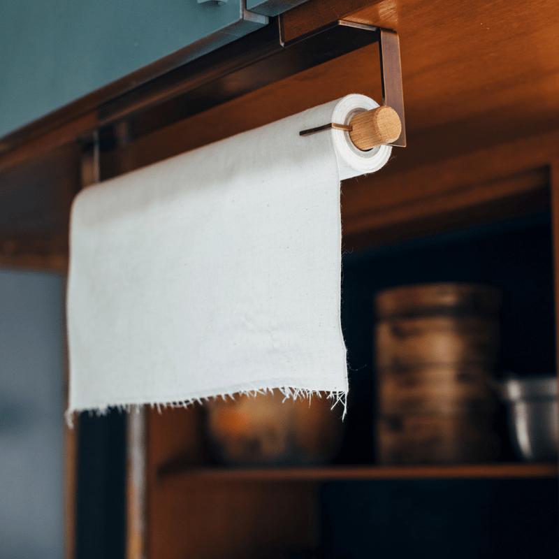 キッチンの棚などに吊るして設置でき、晒を切り取る際に指で押さえやすいように設計しました。