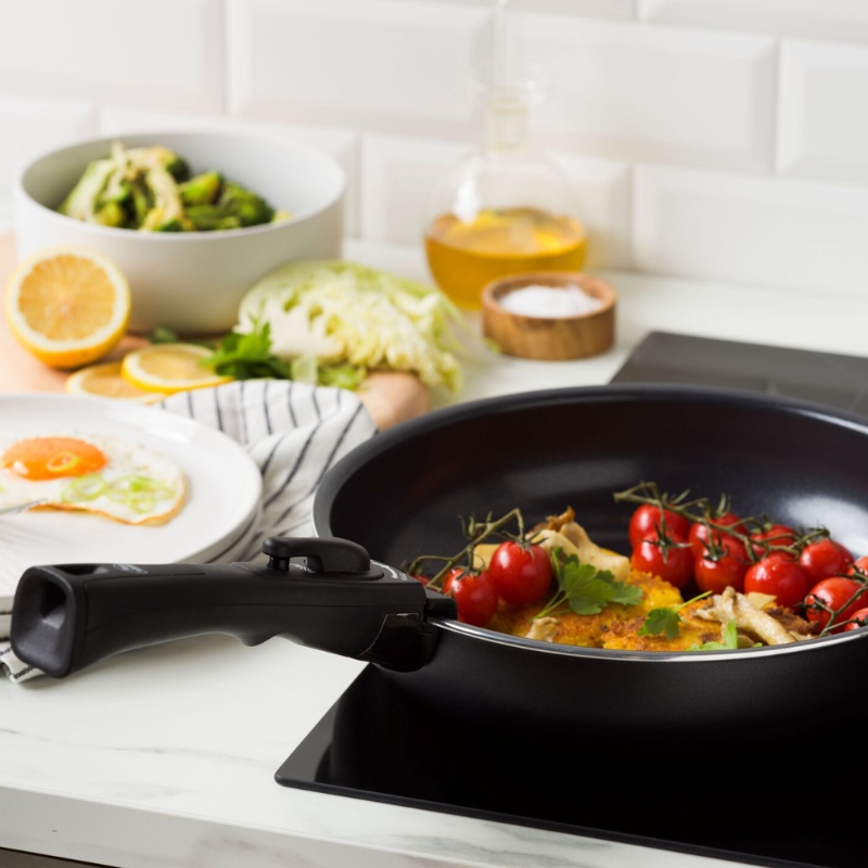 取っ手が外れるので小さめのオーブンでも調理が可能。 グラタンなどはコンロで調理してからそのままオーブンに入れられ、洗い物削減にもつながります。