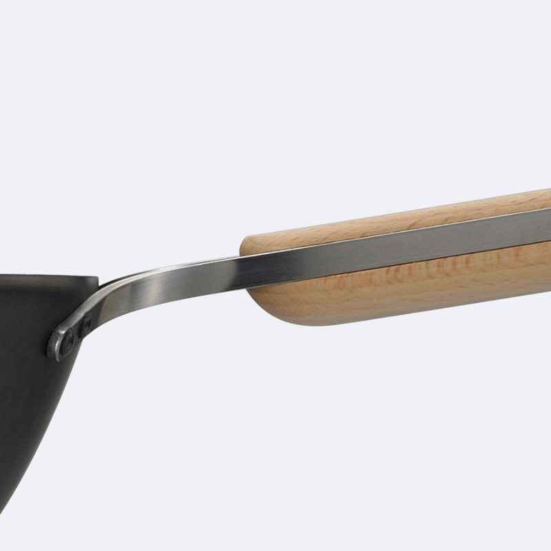 ハンドルは天然木(ブナ)とステンレスのフラットバー(角断面)を組み合わせた握りやすい形状。