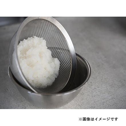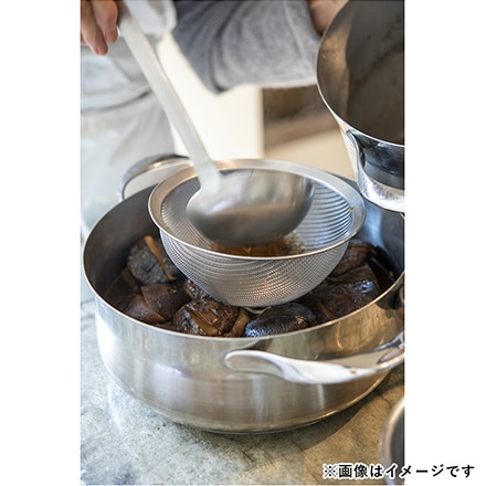 材質は18-8ステンレス鋼を使用しています。 アミは綾織り(※)なので、従来のざるより丈夫で、パンチング材のざると比べ、格段に水切れがよいです。 ※綾織りとは、縦線横線が互いに二本ずつ乗り越して上下に交差した織り方です。 平織りでは使用する事のできない太い線材を用いる事ができ、強度が優れています。 足つきなので、水切りがよく清潔です。 より早くスムーズに水切りしたいときに、ボウルの縁に足を引っ掛けて傾斜をつける、という使い方もできます。 縁は一枚の板をくり抜いて作られています。斜め内側に傾斜のついた、平縁タイプです。 縁のつなぎ目が無いので、汚れがたまらず洗いやすいです。