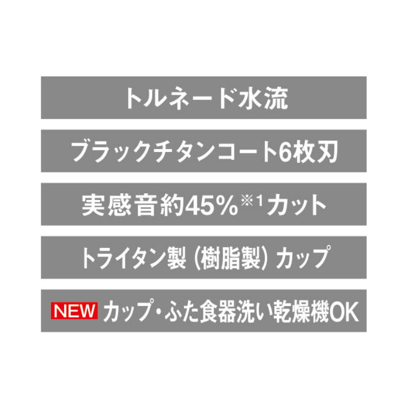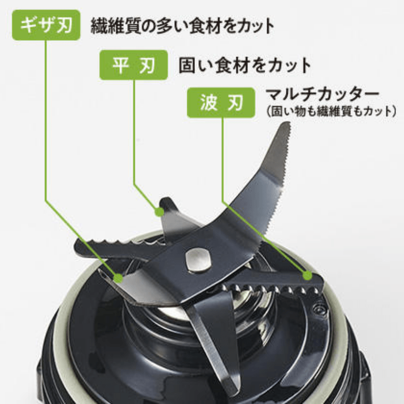 ブラックチタンコート6枚刃で、砕き残りが起こりやすい人参などのかたい食材や角氷もかんたんに細かく粉砕します。