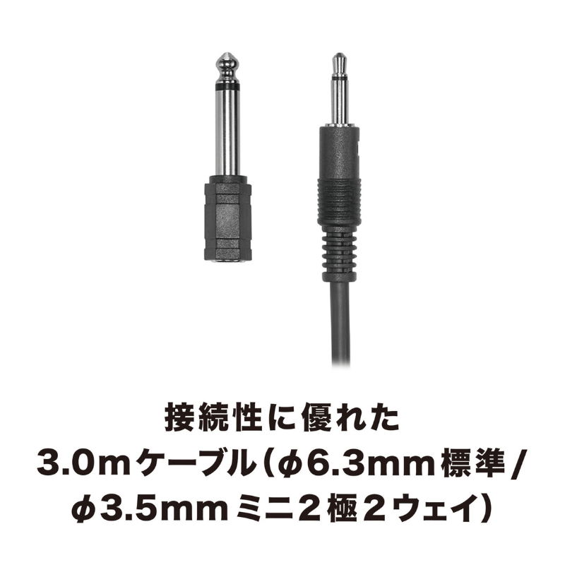 直出しの3.0mケーブル(3.5mmモノラルミニプラグ)と、付属の6.3mmモノラル変換アダプターで、